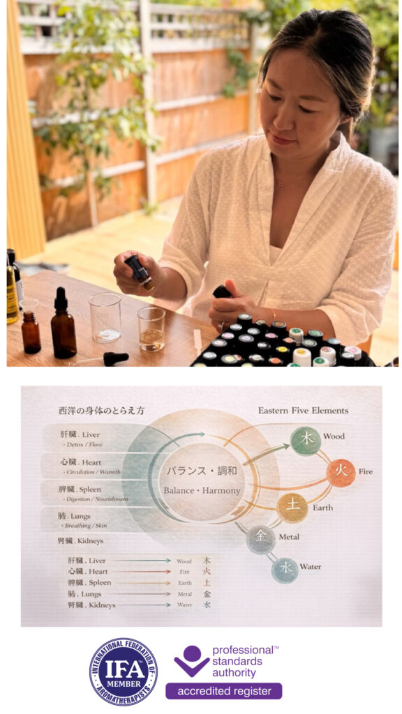 ロンドンで自然化粧品ブランドの仕事に携わった際、エッセンシャルオイルの香りに魅了され、アロマセラピー入門講座に軽い気持ちで参加。その効果に驚き、一晩中ぐっすり眠れた経験が、本格的な学びのきっかけになりました。