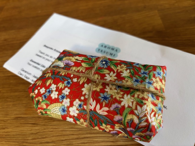 - 完成後、郵送または手渡しでお渡しします。 使用方法、選択した精油の特徴などを記載したアフターケアノートと一緒に千代紙のラッピングでお届けしています。